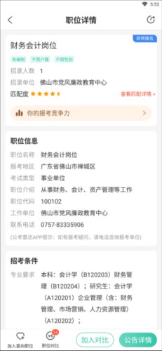 2、点击适合的考试进入查看[公告详情][职位列表],选择职位详情查看