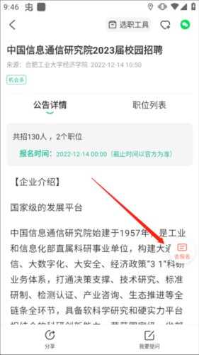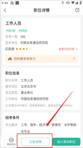 1、进入岗位详细页面,点击最下放公告详细,同时我们也点击“加入意向职位”方便对比其他职位