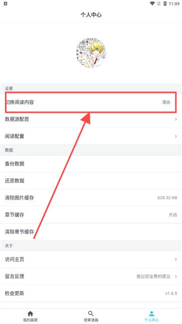 1、先在个人中心中点击”切换阅读内容“进入,选择番剧