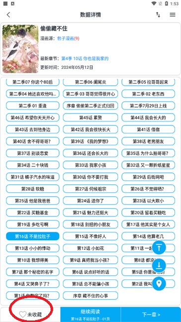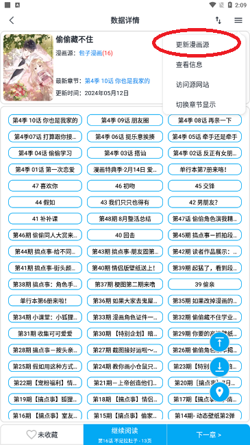4、详情页可以切换漫画源、阅读最新章节、继续阅读等。