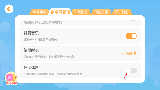 3、找到并点击“学习管理”,将页面滑动至最底部,点击右侧的开关,这样就能开启夜间休息时间。