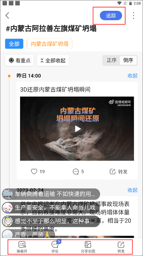 3、当进入新闻详情页面后,点击页面右上方的“追踪”按钮,此时你便能针对该事件发表个人看法或见解。