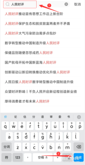 打开人民日报APP进入后,点击上方的搜索框,搜索“人民时评”。(如图所示)