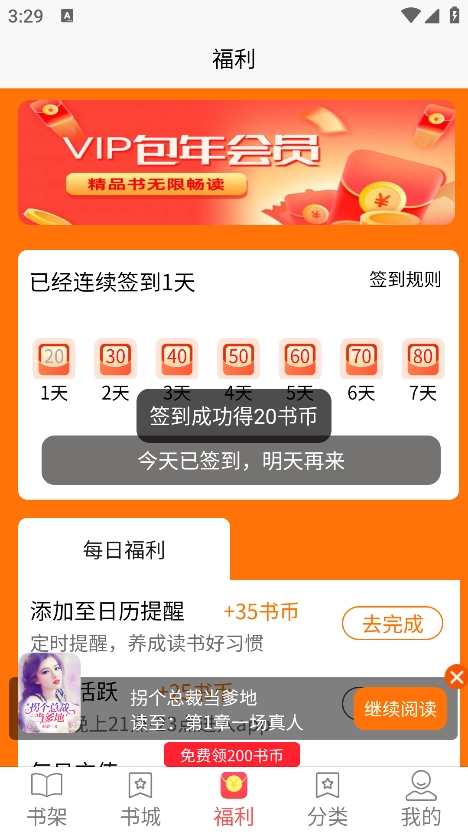 3、然后即可签到成功获得奖励