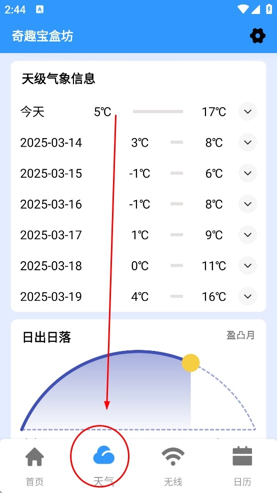 3、轻点 “天气” 选项,即可查看当天以及未来几日的天气状况。